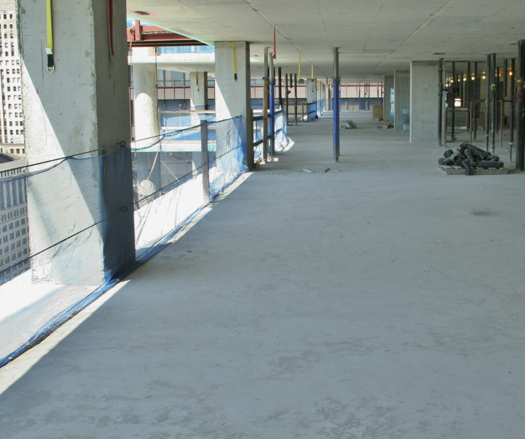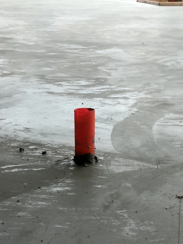 After the concrete pour, the HDPE (High Density Poly-Ethylene) sleeve and support are cut down to the top of concrete elevation and left in the slab until the future raceway is ready to be safely extended into a wall cavity.